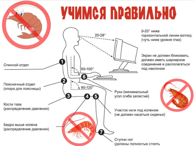 • Сидеть нужно правильно, оставим креветкам – креветково. На картинке подробная схема здоровой посадки, лучше всего она достигается хорошим офисным креслом.